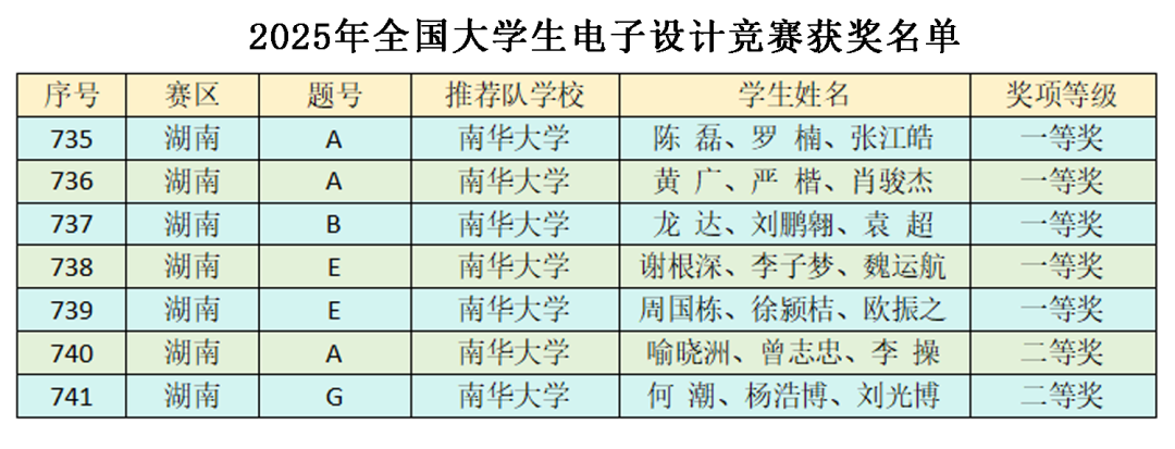 一叶知秋,金风送爽。2025年全国大学生电子设计竞赛成绩揭晓。南华大学参赛代表队在此项高水平全国性学科竞赛中,共荣获全国一等奖5项、全国二等奖2项获全国一等奖数量位列湖南省参赛高校首位跻身全国前十。此外,在2025年第二十届中国研究生电子设计竞赛全国总决赛中获全国总决赛技术赛道一等奖和二等奖。