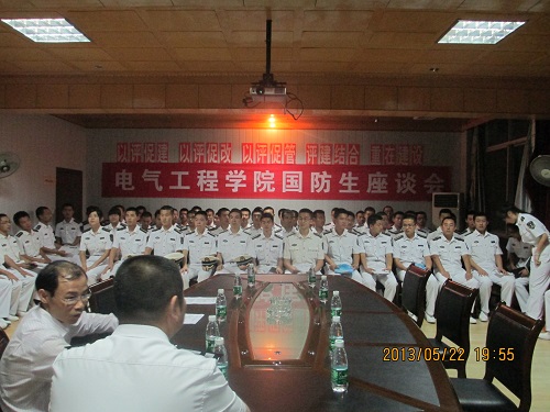 此次座谈会在院党委副书记谭德明老师的主持下开展,与会的有海军驻南华大学选拔培养办公室主任徐军、辅导员冯勇,学院院长赵立宏、辅导员管龙陵和禹敏、专业教师杨斌和郭玮,以及学院全体国防生。