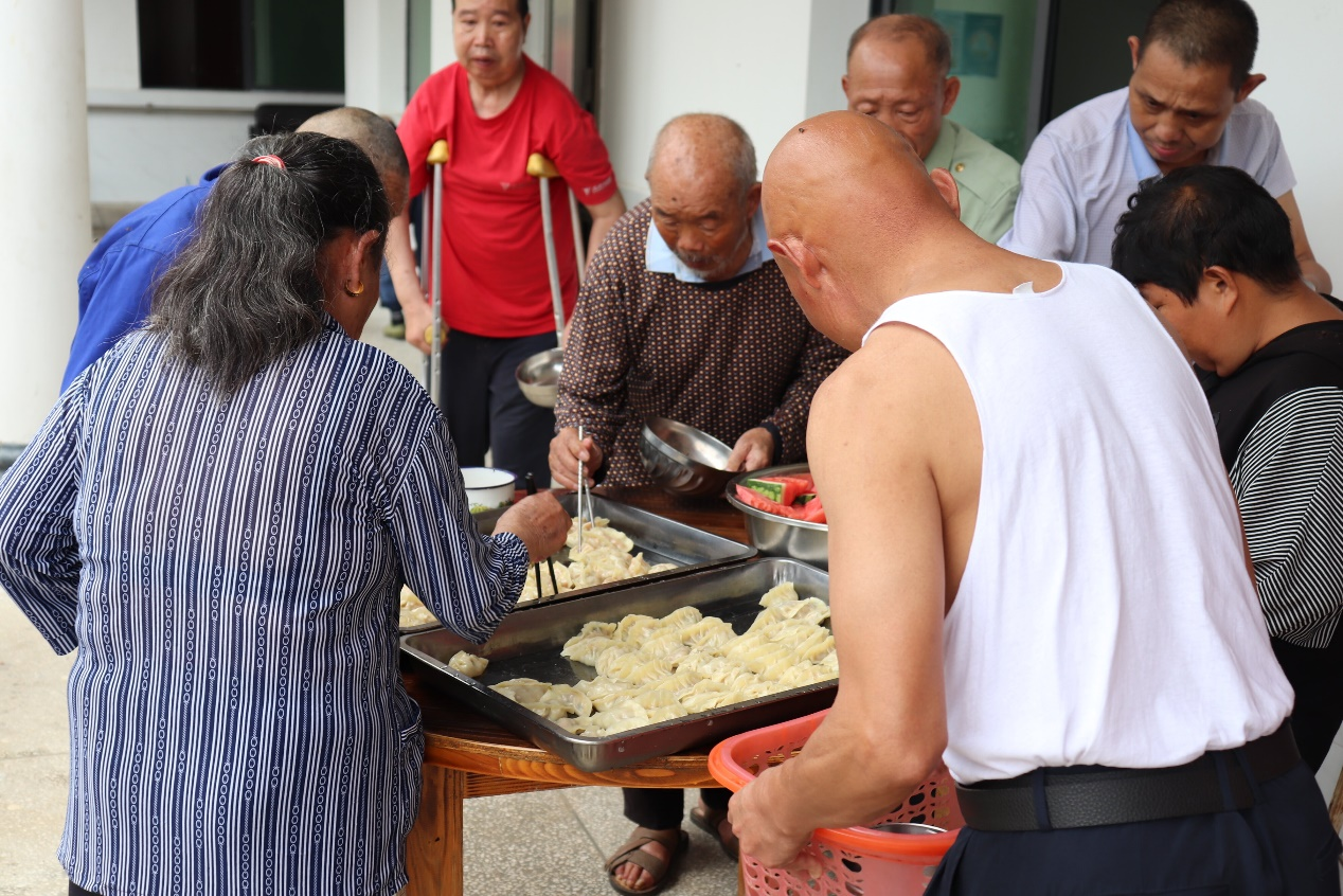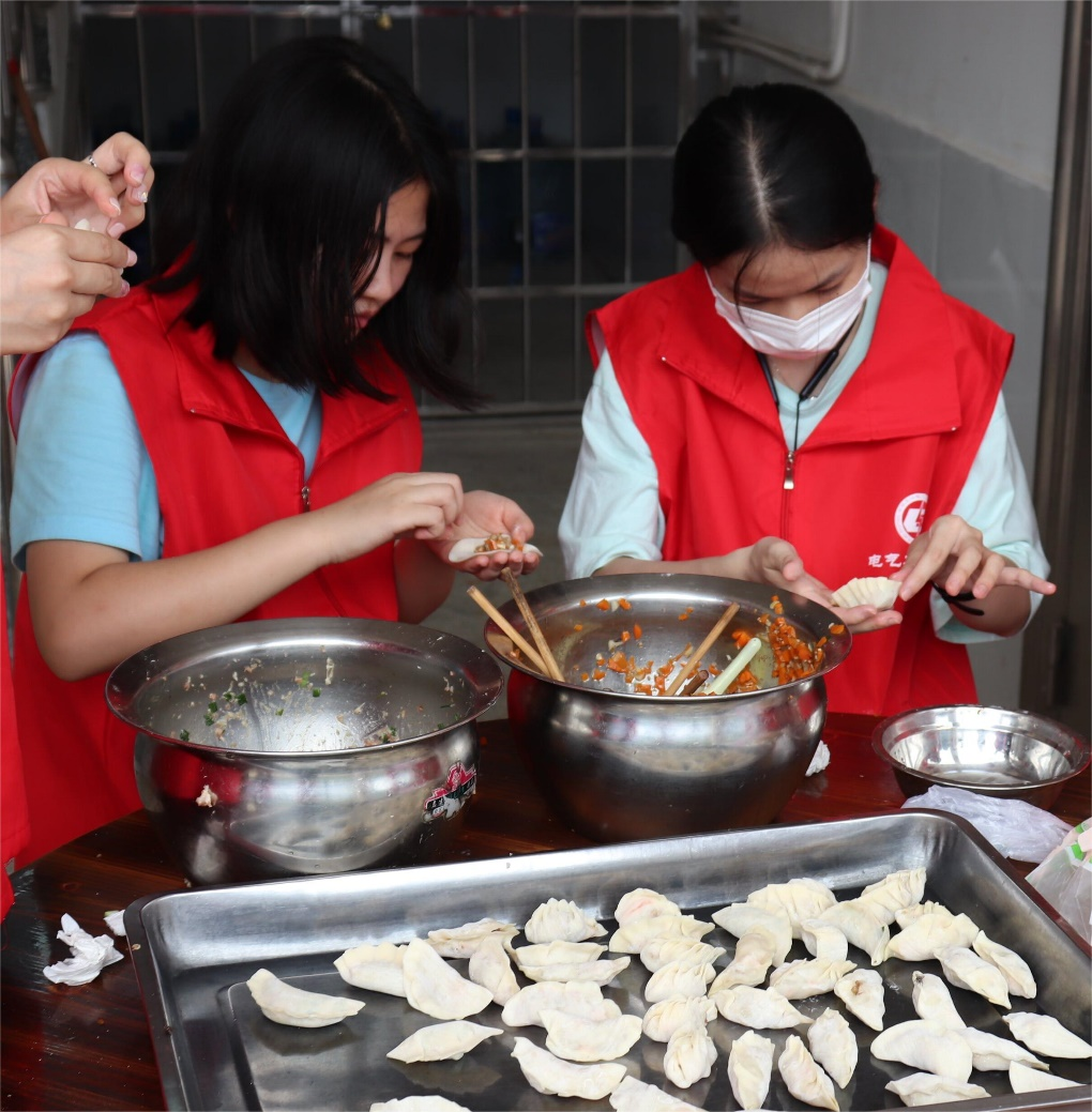 厨房里,另一部分同学们在忙碌着,给老人们准备着饺子。他们有人洗菜、切菜,有人包饺子,分工有序。饺子做好后,老人们夹起饺子吃的津津有味。席间,老人们与同学们亲切交谈,整个院子都洋溢着家的温馨和天伦般的快乐。