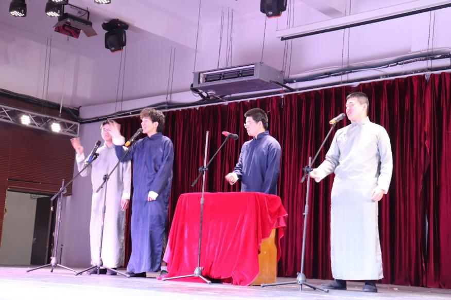 校曲艺团带来的相声《怯之旅》用幽默的语言和夸张的表现,给观众带来开心与欢笑。