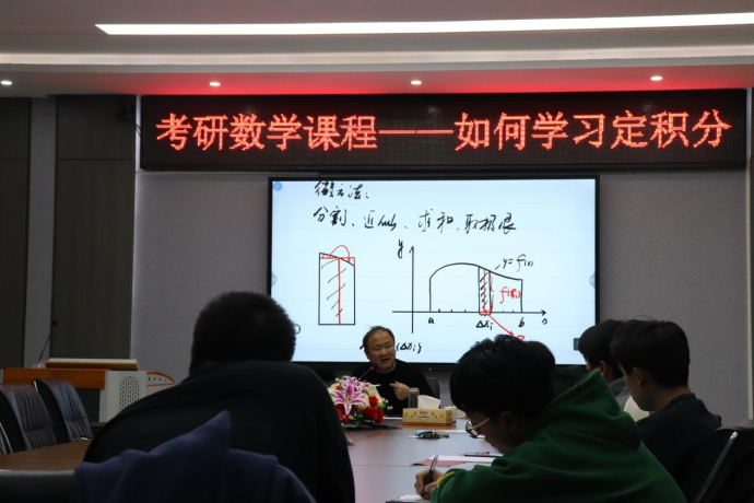 朱老师首先从π的含义和发现历史来引出定积分的概念,将原本晦涩的数学概念转换为生动的具体形象。之后,为学生们分析了考研的复习方法,更进一步地剖析了有关于定积分的核心考点,让在座的学生能够直接客观的了解到考研数学的主要内容。