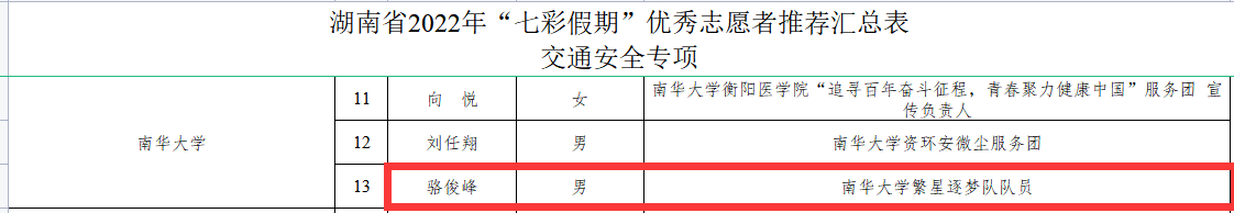 我校繁星逐梦队通过层层选拔、申报、专业评选等环节,在全省众多志愿服务队伍中脱颖而出。我院繁星逐梦队荣获高校优秀志愿服务团队、戴宇涛同学荣获高校优秀志愿者荣誉称号、骆俊峰同学荣获高校优秀志愿者(交通专项)荣誉称号。