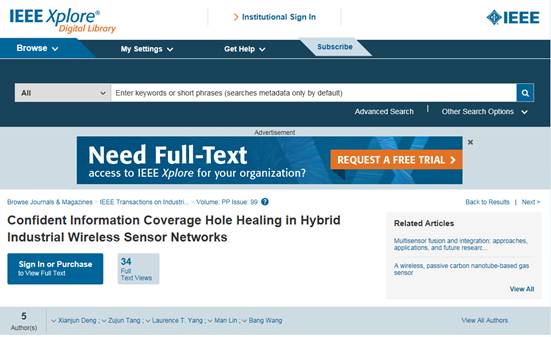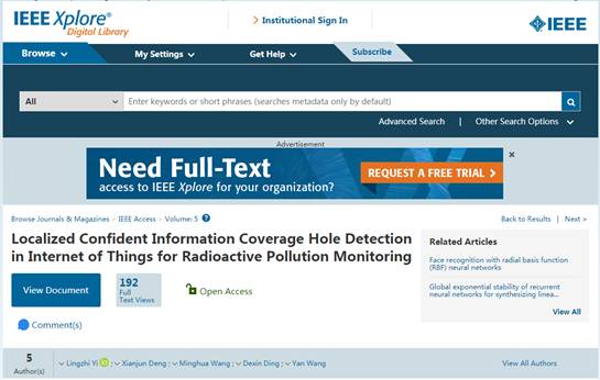 在上述研究的基础上,综合考虑节点的通信能力、通信半径及能量损耗,以高效节能的方式充分利用单跳邻居传感器节点的协作和通信能力,传感器节点的定位和分布以及监测的物理变量的空间相关性,设计了一系列的启发式解决方案,以贪婪和递归的方式对潜在的覆盖盲区进行局部检测。仿真结果表明:论文提出的局部可信信息覆盖空洞检测方法可以高效节能对可信信息覆盖空洞进行局部检测,有效提升了网络的覆盖性能和服务质量。该研究成果:“Localized Confident Information Coverage Hole Detection in Internet of Things for Radioactive Pollution Monitoring”于2017年9月在信息科学领域著名学术期刊《IEEE Access》发表,南华大学为第一作者单位,邓贤君副教授为通讯作者。