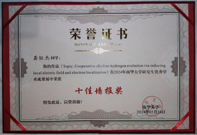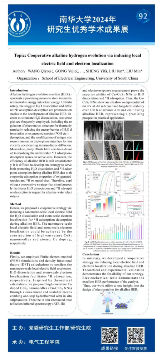 龚钰杰是内射中出喷高清电子科学与技术专业2021级研究生,从事电解水制氢的研究,指导老师为刘俊博士。本次展出的研究成果针对碱性电解水产氢时水解离速度缓慢以及H中间体吸脱附困难等问题,提出了一种纳米针尖电场与原子局域电场耦合策略,有效提升了碱性电解水性能。相关成果发表在中科院一区期刊Angewandte Chemie(IF=16.6) 和Chinese Journal of Catalysis (IF=16.5)上。