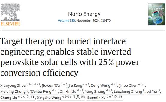 近日,南华大学内射中出喷高清王行柱、刘畅团队在国际顶尖学术期刊Nano Energy(中科院1区Top期刊,IF=16.8)上发表了题为“Target therapy on buried interface engineering enables stable inverted perovskite solar cells with 25 % power conversion efficiency”的研究论文。