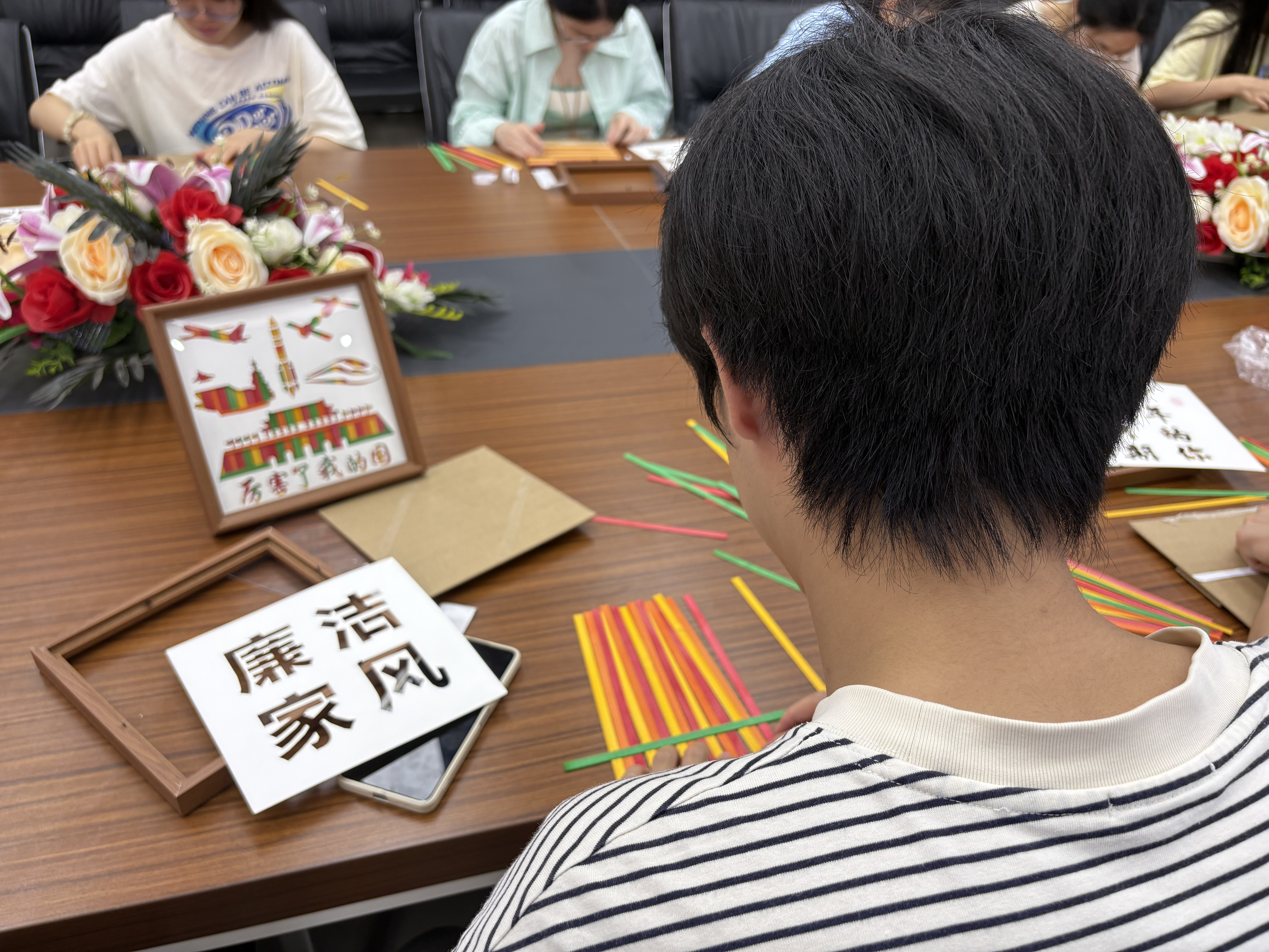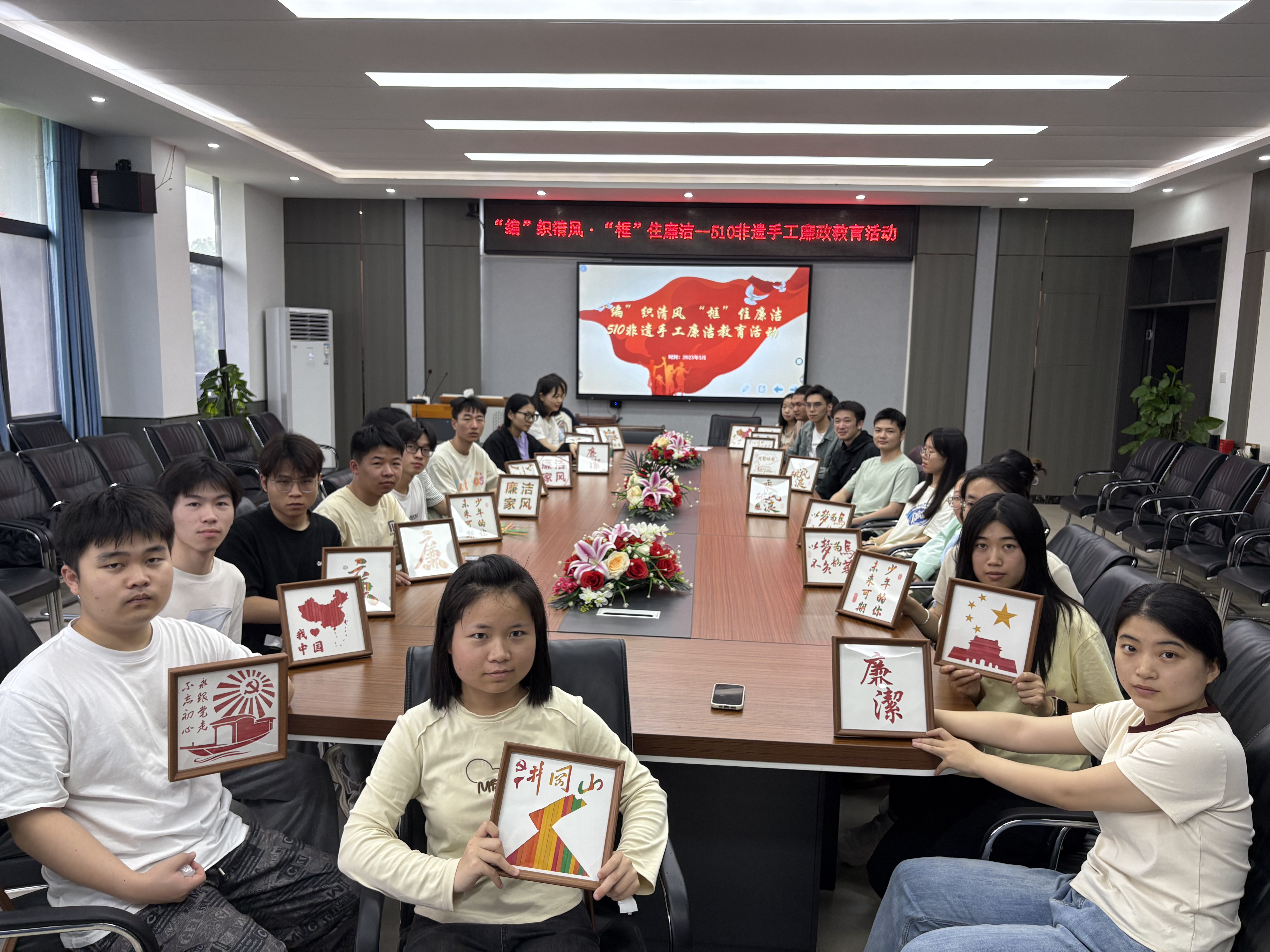 5月7日,学院20余名师生齐聚一堂,以竹为媒开展廉政文化创作。活动现场,竹篾翻飞间,师生们通过经纬编织技法,将象征清正廉洁的莲花、翠竹等图案定格在竹编画框之中。从选材时精选挺拔的竹节,到编织时经纬分明的交错,再到装裱时方正规整的收边,每个步骤都如同修身立德的过程——正如竹子‘虚心抱节’的特质,唯有严谨自律,方能成就清正品格。